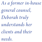 Whether your company's needs involve strategic matters such as formation of the right type of entity, buying or selling a business, or expanding the company's capital availability through debt or equity investors, or serving as your company's legal counselor for more day-to-day operational legal matters such as corporate governance issues, ongoing contract review and negotiations including non-disclosure agreements or licensing and distributing agreements, Deborah works with you to find the right business solution.